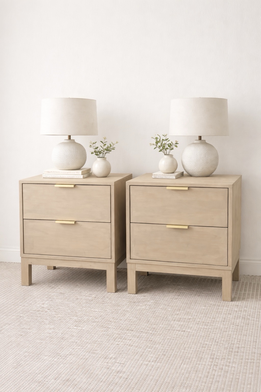 El respaldo con diseño vertical le da carácter sin recargar, mientras que los veladores aportan funcionalidad y orden para el día a día. Su tono albayalde es suave y luminoso, ideal para aclarar el ambiente y dar una sensación de amplitud, manteniendo siempre una estética natural y elegante.